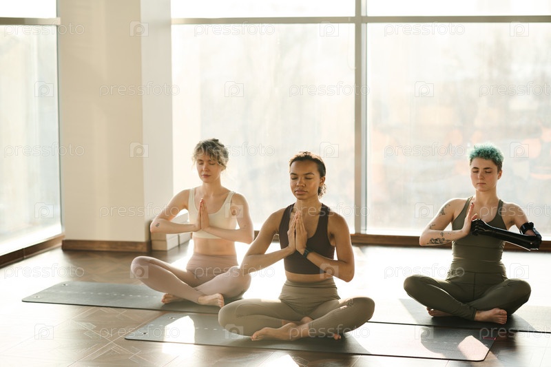 Группа молодых женщин, занимающихся йогой