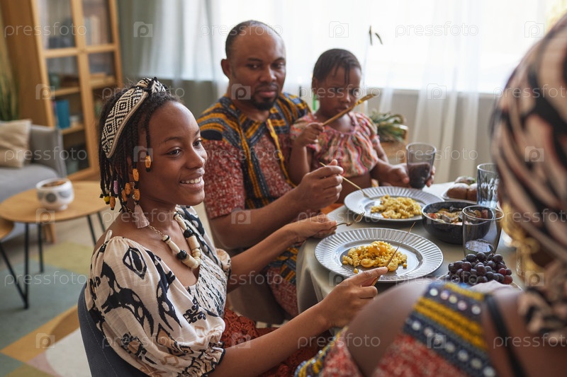 Африканская семья в традиционных костюмах ужинает на празднике