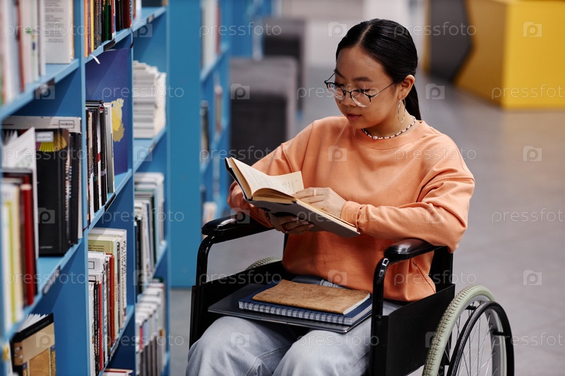 Азиатская девочка с инвалидностью в библиотеке колледжа читает книги