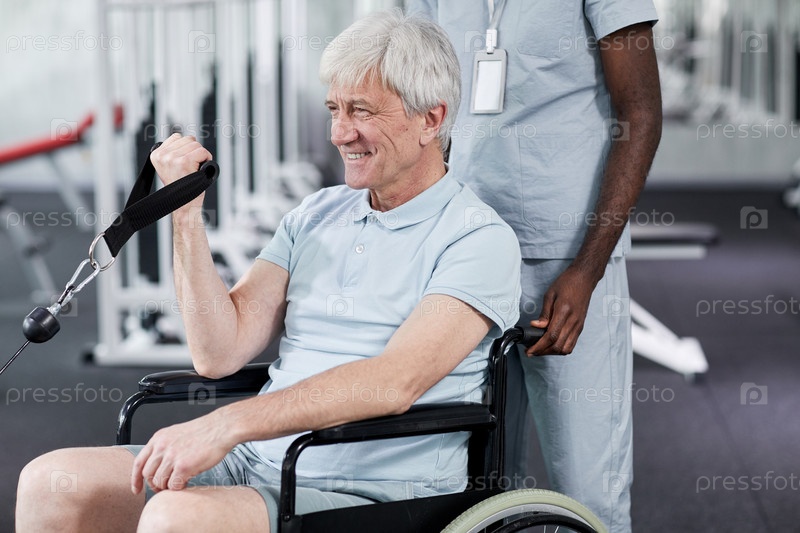 Улыбающийся пожилой человек в инвалидном кресле на реабилитации