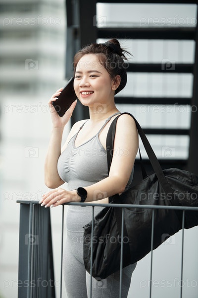 Женщина с сумкой для занятий спортом звонит по телефону