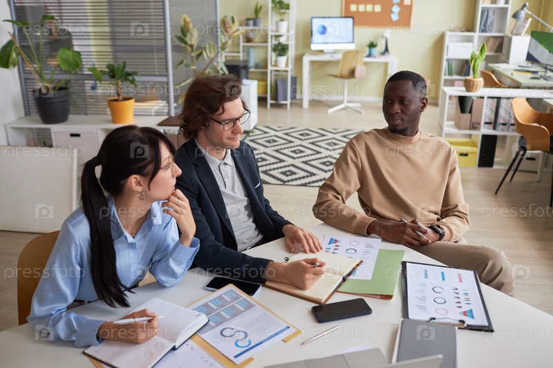 Молодая бизнес-команда сидит за столом заседаний в офисе и мозговой штурм