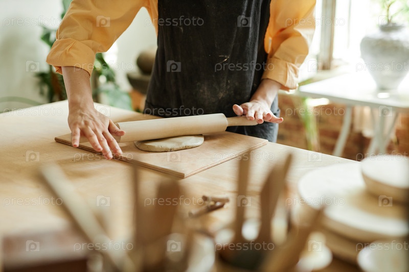 Близкий снимок молодой женщины, делающей керамику ручной работы