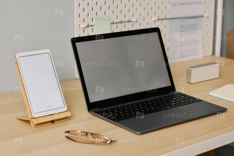 Откройте ноутбук и планшет с белыми экранами на столе на рабочем месте