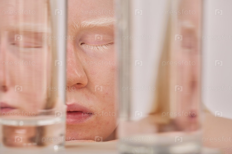 Девушка-альбинос со стаканами чистой воды