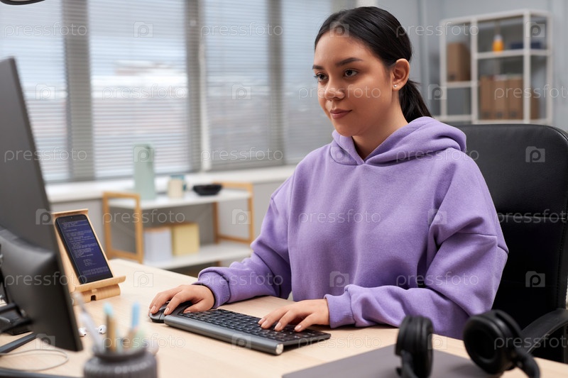 Молодая женщина как профессиональная писательница кодов, работающая на офисном рабочем месте