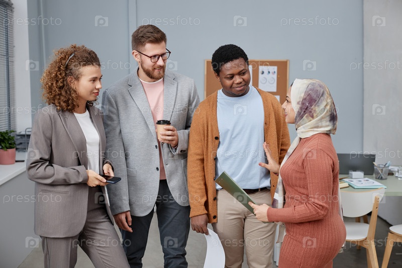 Молодая уверенная в себе деловая женщина с документом, разговаривающая с группой коллег