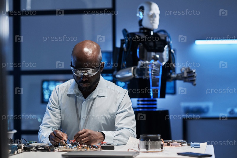Инженер, работающий с материнской платой робота