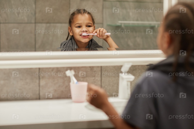 Маленькая девочка чистит зубы в зеркале