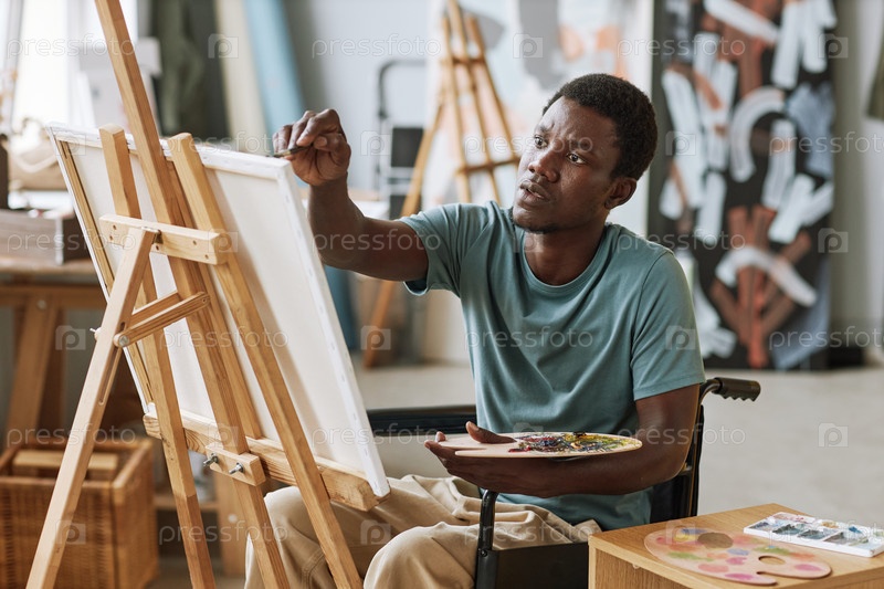 Молодой чернокожий мужчина в инвалидном кресле с цветовой палитрой ручной живописи