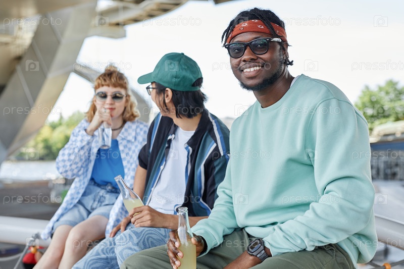 Улыбающийся чернокожий мужчина смотрит на камеру с друзьями