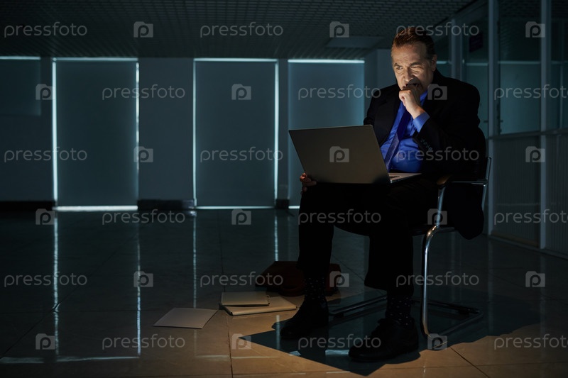 Нервный предприниматель читает статью о криптовалютных тенденциях