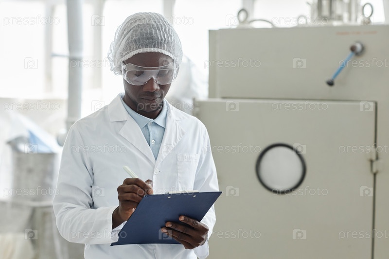 Чернокожий молодой человек в лабораторном пальто на фармацевтической фабрике
