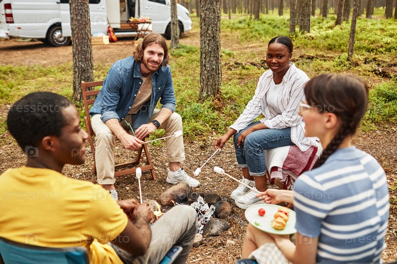 Друзья жарят баклажаны на костре снаружи