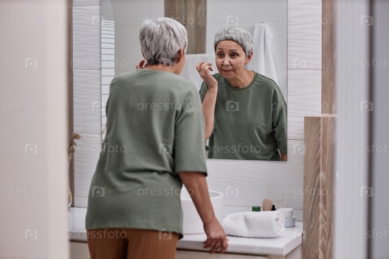 Вид на старшую азиатскую женщину, которая смотрит в зеркало и использует крем для спины