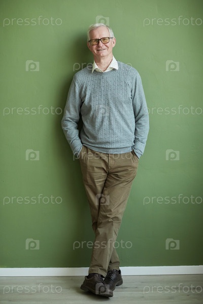 Счастливый пожилой человек в обычной одежде стоит у зеленой стены