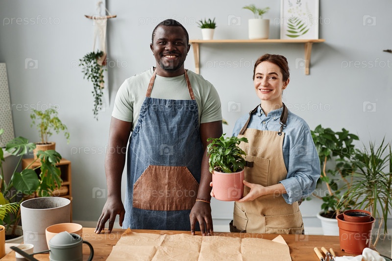 Два улыбающихся садовника смотрят на камеру, заботясь о растениях в помещении