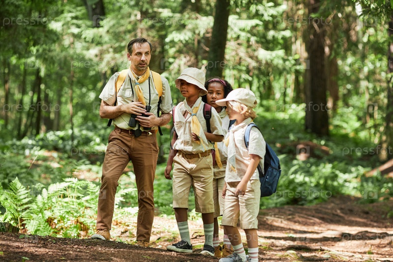 Скауты, путешествующие по лесу с взрослым лидером
