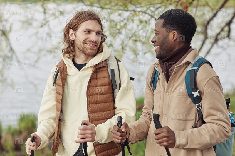 Друзья, которые вместе ходят по скандинавской прогулке