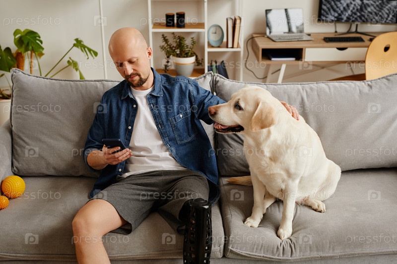 Мужчина с протезированной ногой отдыхает на диване и гладит белую собаку