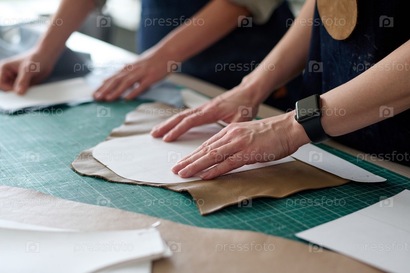 Близкий план рук двух женщин-ремесленников или кожевниц с швейными узорами
