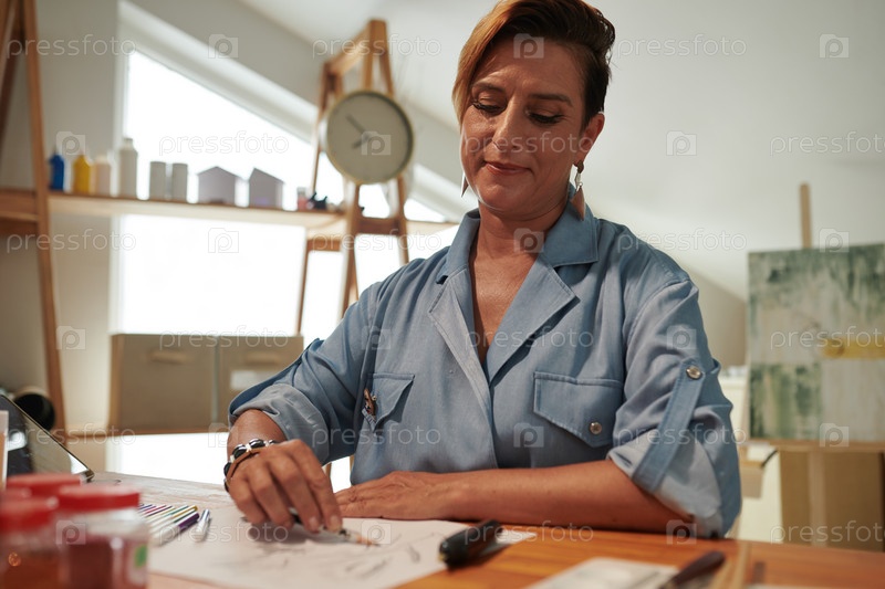 Улыбающаяся зрелая женщина наслаждается рисованием картин за своим столом