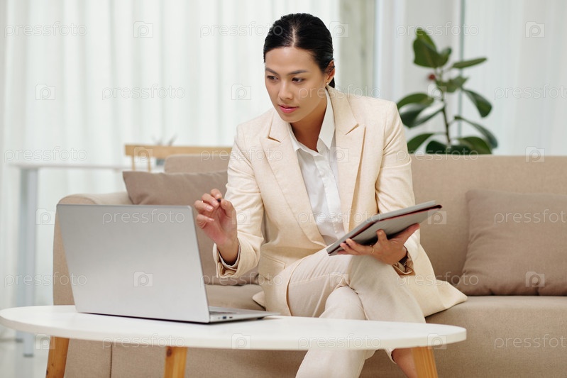 Молодой уверенный в себе исполнительный директор офиса с планшетом смотрит на экран ноутбука