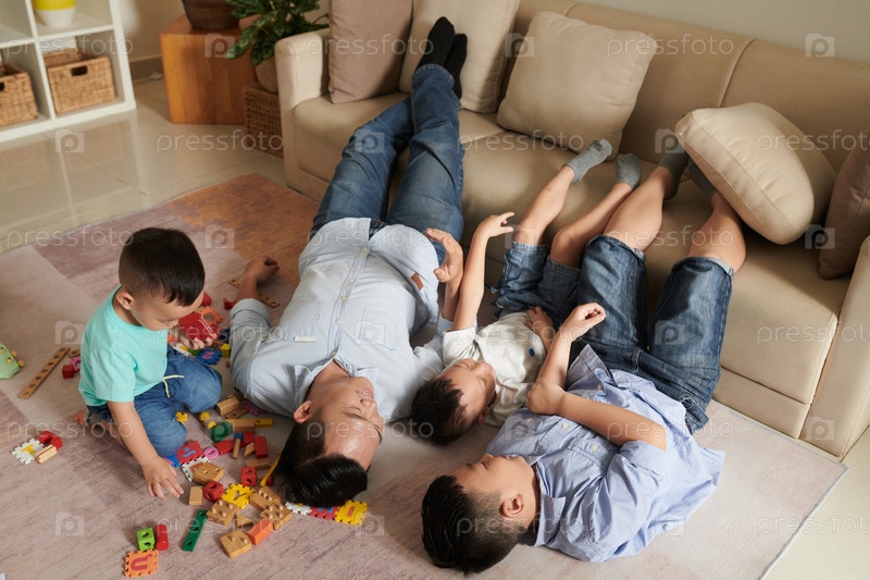 Отец и сыновья лежат на полу