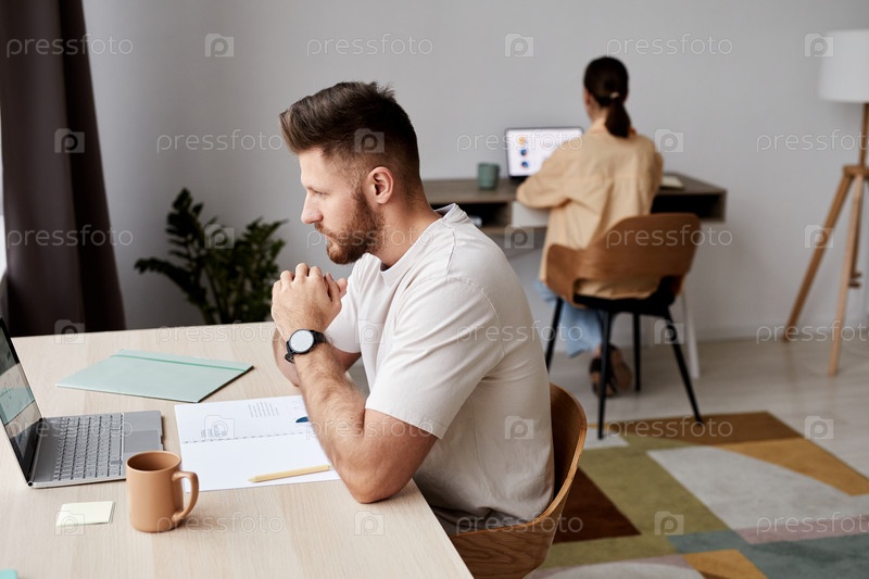 Боковой вид серьезного студента или фрилансера, сидящего перед ноутбуком у стола