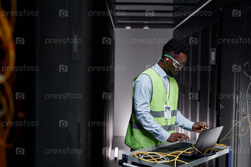 Молодой сетевой техник ремонтирует серверы в центре обработки данных