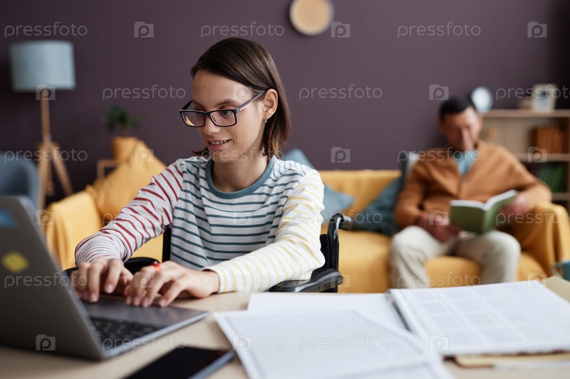 Улыбающаяся девочка-подросток с инвалидностью использует компьютер дома, изучая онлайн