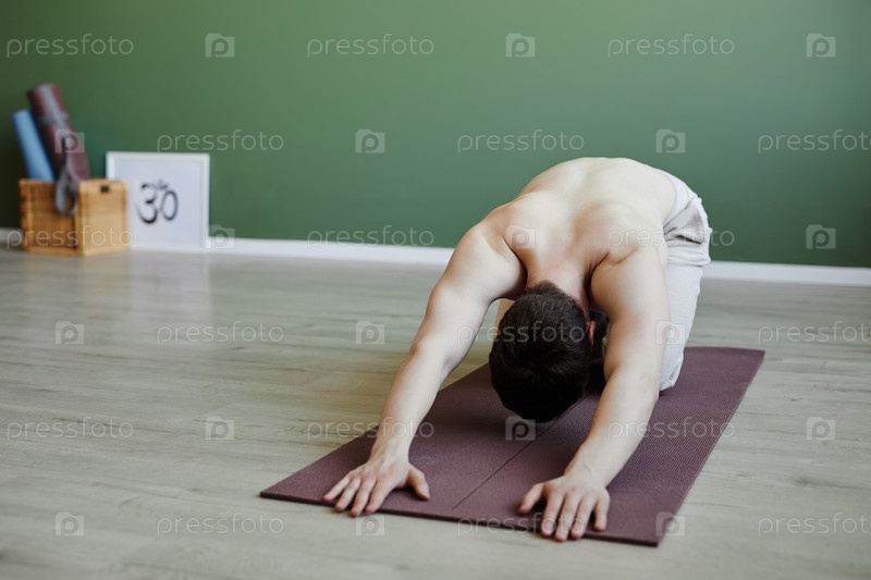 Молодой мужчина без рубашки занимается йогой и отдыхает в Баласане