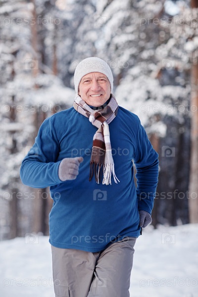 Улыбающийся старший мужчина бежит зимой