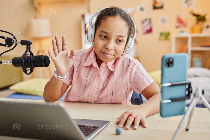 Красивая школьница машет рукой и смотрит на экран смартфона