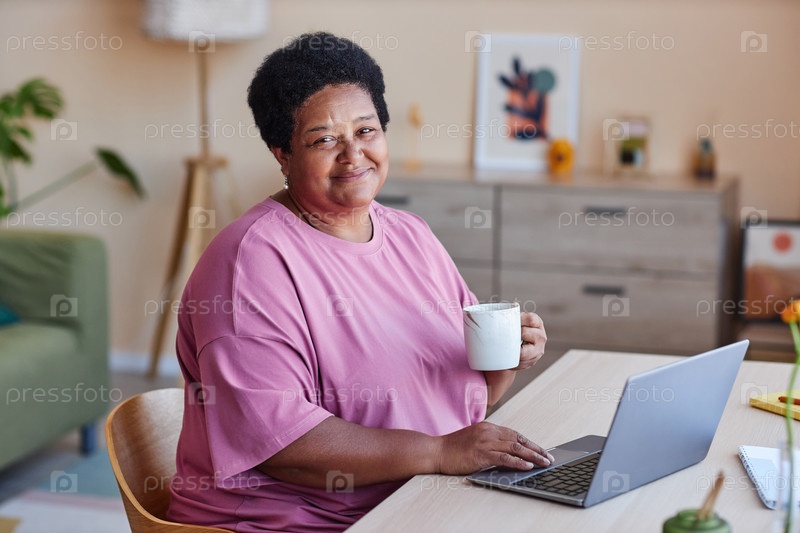 Счастливая пожилая женщина с чашкой чая или кофе смотрит в камеру