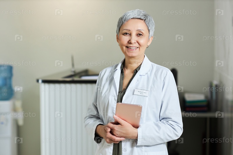 Улыбающаяся старшая женщина-врач, одетая в лабораторный халат на клинике и смотрящая на камеру