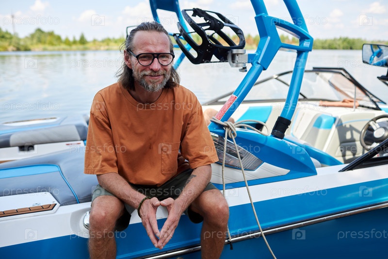 Улыбающийся бородатый мужчина сидит на лодке, занимаясь водными видами спорта на открытом воздухе