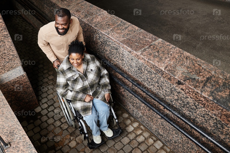 Пара с мужчиной в инвалидной коляске, использующая Рэмпу в черном городе