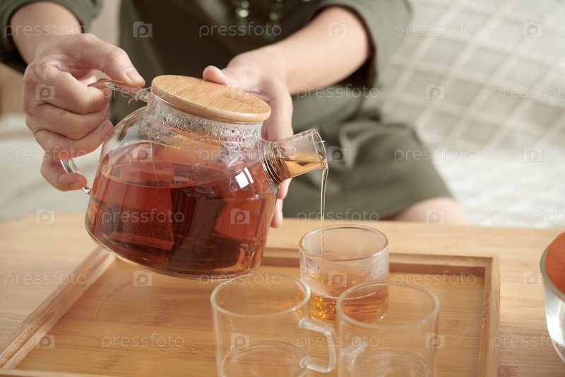 Женщина, наливающая чай в чашки