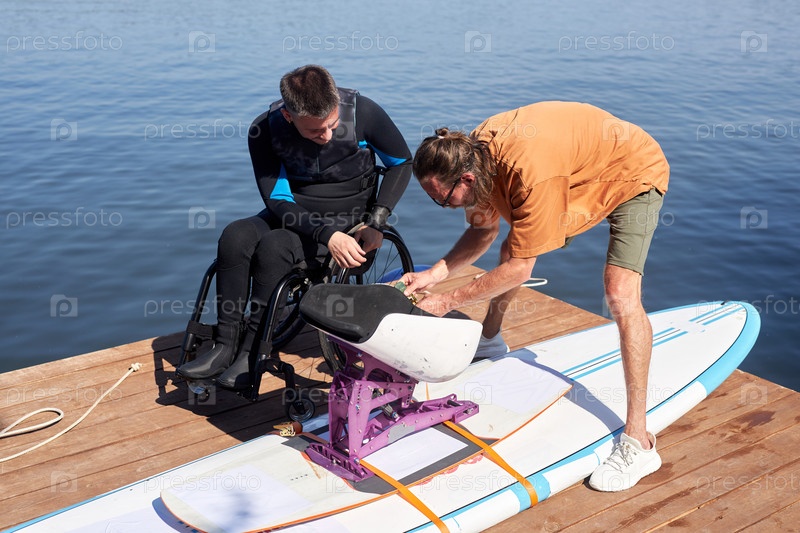 Спортивный инструктор собирает адаптивное оборудование для вейкборда