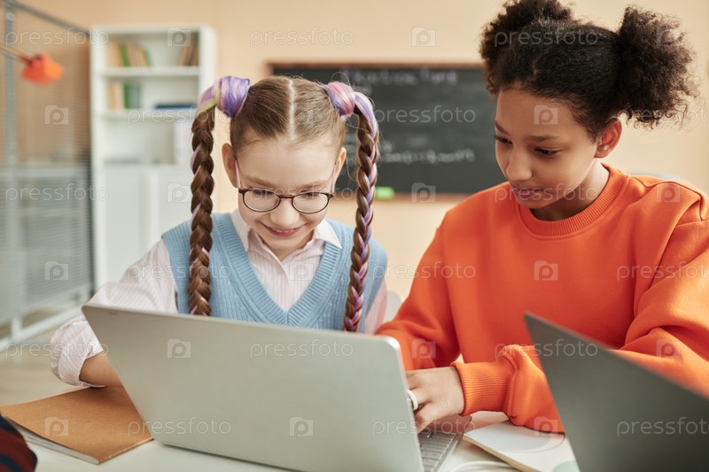 Две школьницы-подростки, использующие ноутбук в классе и смотрящие на компьютерный экран