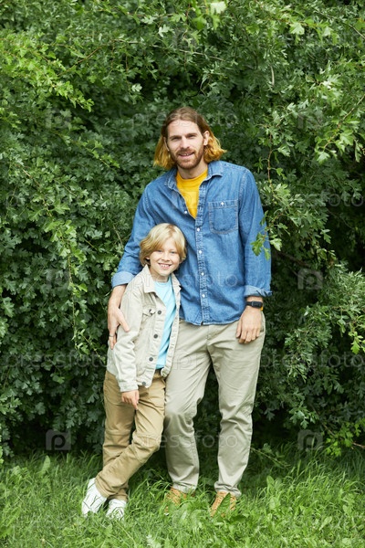 Портрет счастливого отца и сына, стоящих против зелени в парке