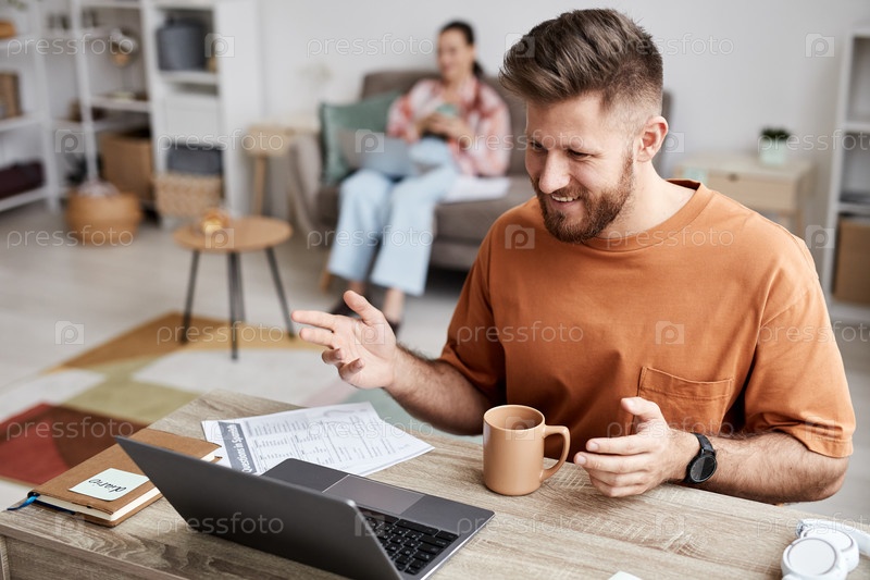 Молодой улыбающийся мужчина в повседневной одежде сидит перед ноутбуком во время онлайн-урока