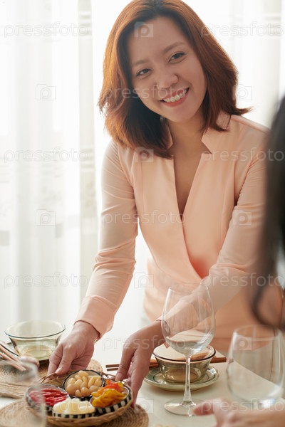 Женщина, подающая маринованные овощи