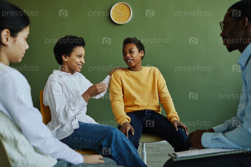 Счастливая школьница объясняет свое беспокойство группе поддержки