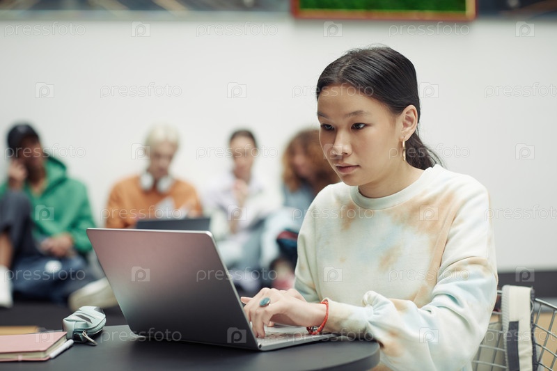 Азиатская девочка-подросток в белой свитерке смотрит на экран ноутбука и печатает