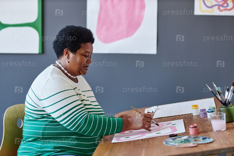 Боковой вид зрелой женщины-пенсионера с живописью кистью на листе бумаги