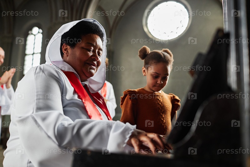 Женщина из церковного хора играет на пианино