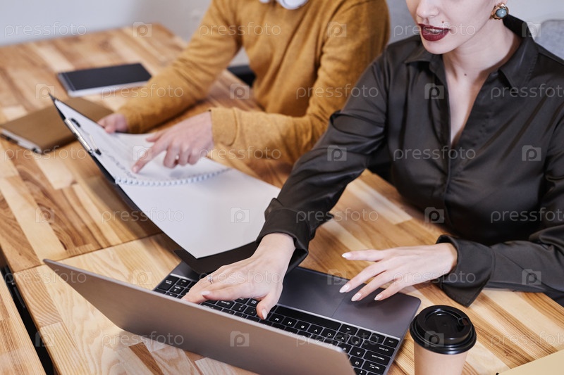 Вид сверху мужчина и женщина, которые используют ноутбук вместе в офисе и указывают на экран