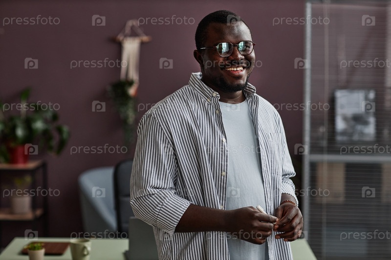 Улыбающийся чернокожий мужчина смотрит на камеру, стоящий в современном офисе